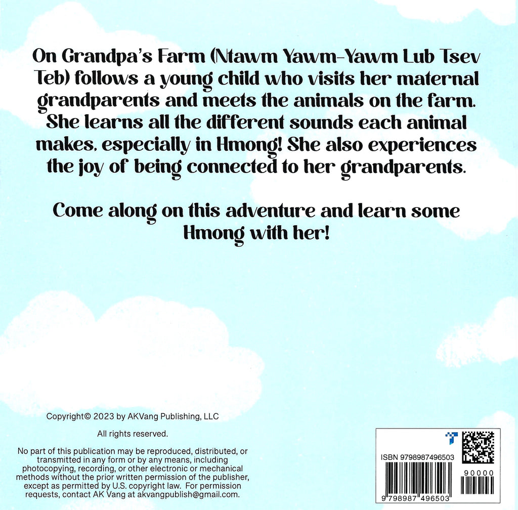 On Grandpa’s Farm (Ntawm Yawm-Yawm Lub Tsev Teb) follows a young Hmong-American child who visits her maternal grandparents and meets the animals on the farm. She learns the sounds of the animals on the farm, especially in Hmong, and experiences the joy of spending time with her grandparents. Come along this adventure and learn some Hmong too!