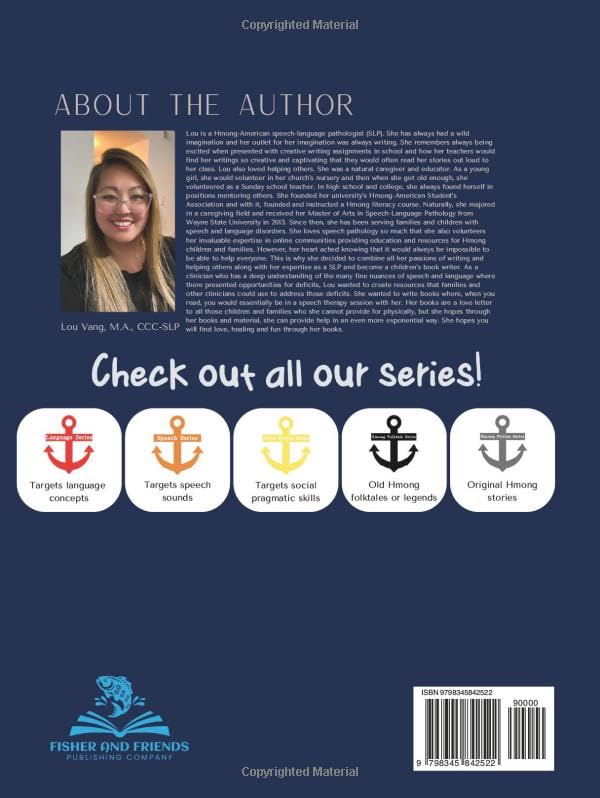 Lou Vang is a Hmong-American speech-language pathologist (SLP). She has always had a wild imagination and her outlet for her imagination was always writing. She remembers always being excited when presented with creative writing assignments in school and how her teachers would find her writings so creative and captivating that they would often read her stories out loud to her class. Lou also loved helping others. She was a natural caregiver and educator. As a young girl, she would volunteer in her church’s nursery and then when she got old enough, she volunteered as a Sunday school teacher. In high school and college, she always found herself in positions mentoring others. She founded her university’s Hmong-American Student’s Association and with it, founded and instructed a Hmong literacy course. Naturally, she majored in a caregiving field and received her Master of Arts in Speech-Language Pathology from Wayne State University in 2013. Since then, she has been serving families and children with speech and language disorders. She loves speech pathology so much that she also volunteers her invaluable expertise in online communities providing education and resources for Hmong children and families. However, her heart ached knowing that it would always be impossible to be able to help everyone. This is why she decided to combine all her passions of writing and helping others along with her expertise as a SLP and become a children’s book writer. As a clinician who has a deep understanding of the many fine nuances of speech and language where there presented opportunities for deficits, Lou wanted to create resources that families and other clinicians could use to address those deficits. She wanted to write books where, when you read, you would essentially be in a speech therapy session with her. Her books are a love letter to all those children and families who she cannot provide for physically, but she hopes through her books and material, she can provide help in an even more exponential way. She hopes you will find love, healing and fun through her books.