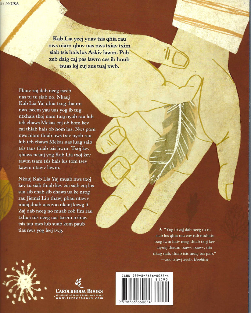 In this moving true story, Kao Kalia Yang shares her experiences as a young Hmong refugee navigating life at home and at school. Having seen the poor treatment her parents received when making their best efforts at speaking English, she no longer speaks at school. Kalia feels as though a rock has become lodged in her throat, and it grows heavier each day. Although the narrative is somber, it is also infused with moments of beauty, love, and hope. Now in Hmong.