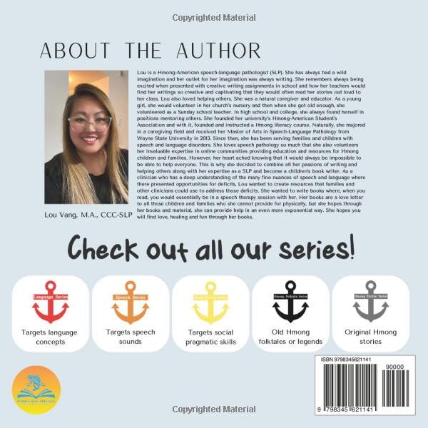 Lou Vang is a Hmong-American speech-language pathologist (SLP). She has always had a wild imagination and her outlet for her imagination was always writing. She remembers always being excited when presented with creative writing assignments in school and how her teachers would find her writings so creative and captivating that they would often read her stories out loud to her class. Lou also loved helping others. She was a natural caregiver and educator. As a young girl, she would volunteer in her church’s nursery and then when she got old enough, she volunteered as a Sunday school teacher. In high school and college, she always found herself in positions mentoring others. She founded her university’s Hmong-American Student’s Association and with it, founded and instructed a Hmong literacy course. Naturally, she majored in a caregiving field and received her Master of Arts in Speech-Language Pathology from Wayne State University in 2013. Since then, she has been serving families and children with speech and language disorders. She loves speech pathology so much that she also volunteers her invaluable expertise in online communities providing education and resources for Hmong children and families. However, her heart ached knowing that it would always be impossible to be able to help everyone. This is why she decided to combine all her passions of writing and helping others along with her expertise as a SLP and become a children’s book writer. As a clinician who has a deep understanding of the many fine nuances of speech and language where there presented opportunities for deficits, Lou wanted to create resources that families and other clinicians could use to address those deficits. She wanted to write books where, when you read, you would essentially be in a speech therapy session with her. Her books are a love letter to all those children and families who she cannot provide for physically, but she hopes through her books and material, she can provide help in an even more exponential way. She hopes you will find love, healing and fun through her books.